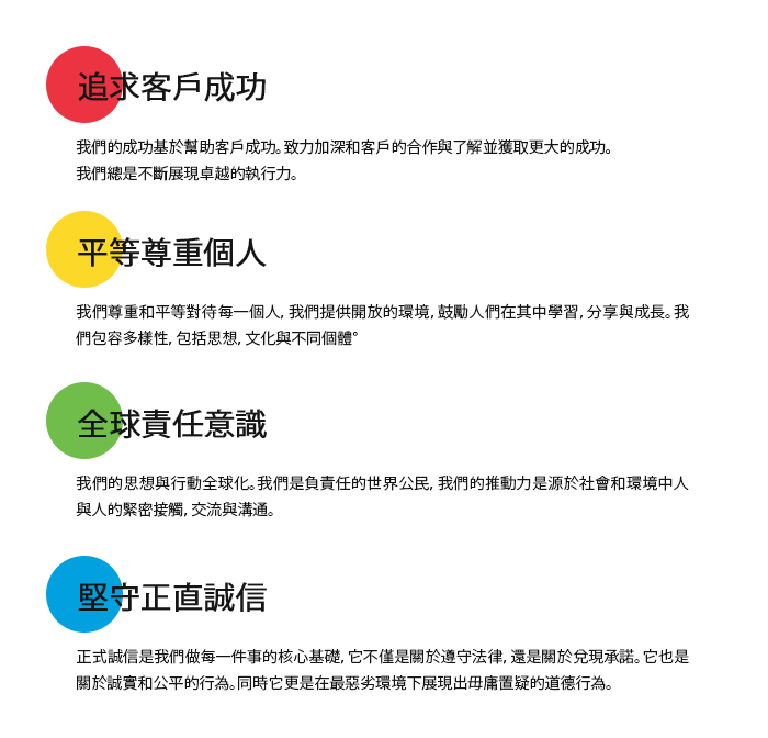 關於我們 > 公司概況 > 我們的價值觀 > 維布絡精神 維布絡精神 維布絡精神是維布絡的核心所在。維布絡精神一方面源自於現實生活,另一方面又反映了維布絡的志向,因此,它注定會貫穿於公司的整個未來。維布絡精神是三種價值觀(即追求成功、敏銳行動和正直誠信)的綜合體,這三種價值觀相互依存,不可分割。