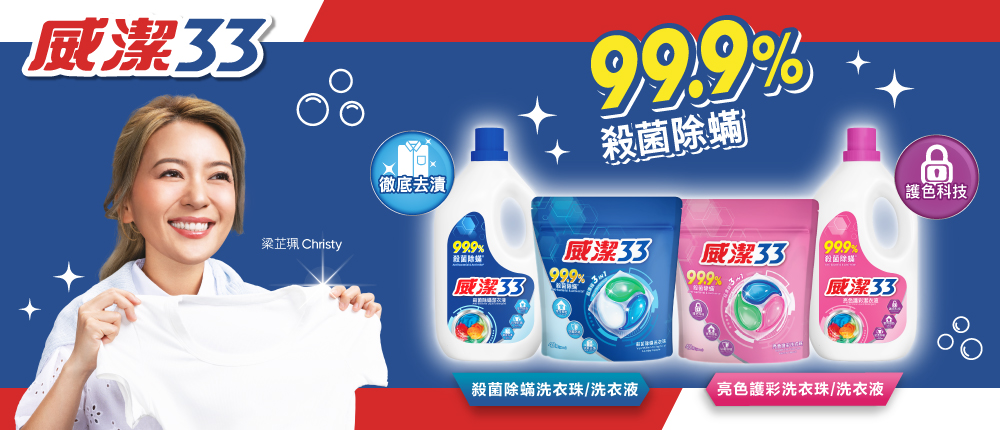 威潔33是香港本地洗衣品牌,扎根香港超過40多年,一直以各款洗衣產品系列,貼心照顧不同消費者的實際需要,包括洗衣粉、嬰兒潔衣液、內衣潔衣液、洗衣消毒劑和衣物柔順劑等等,令每件衣物潔淨重生,推出多年深得顧客愛戴,成為香港最暢銷洗衣品牌之一!
